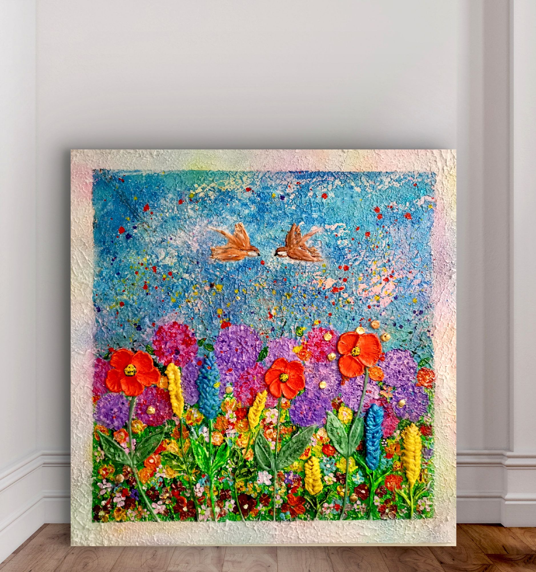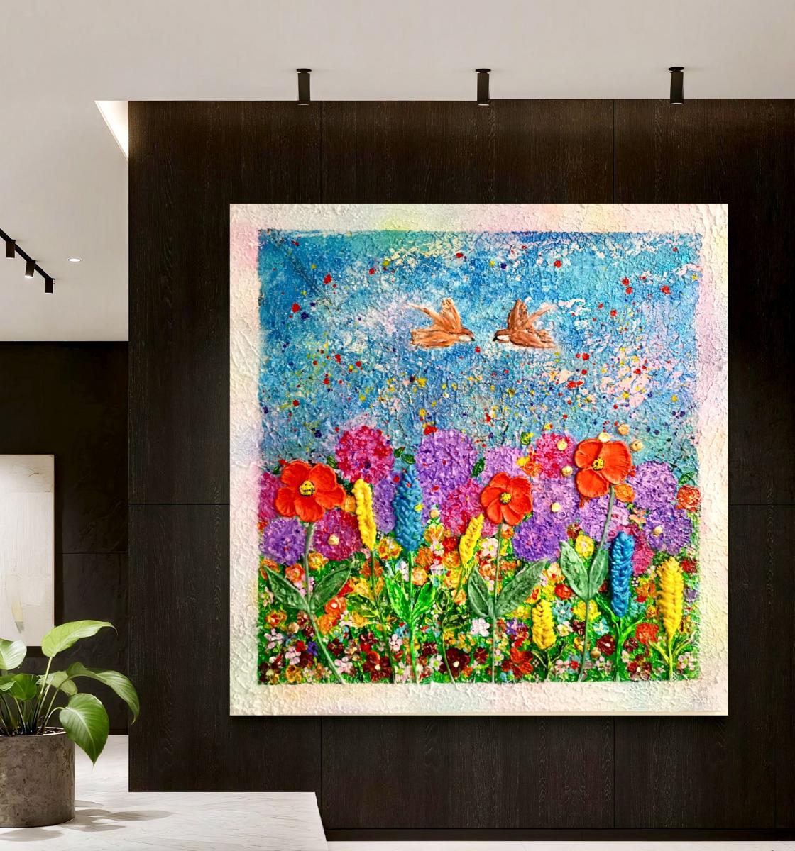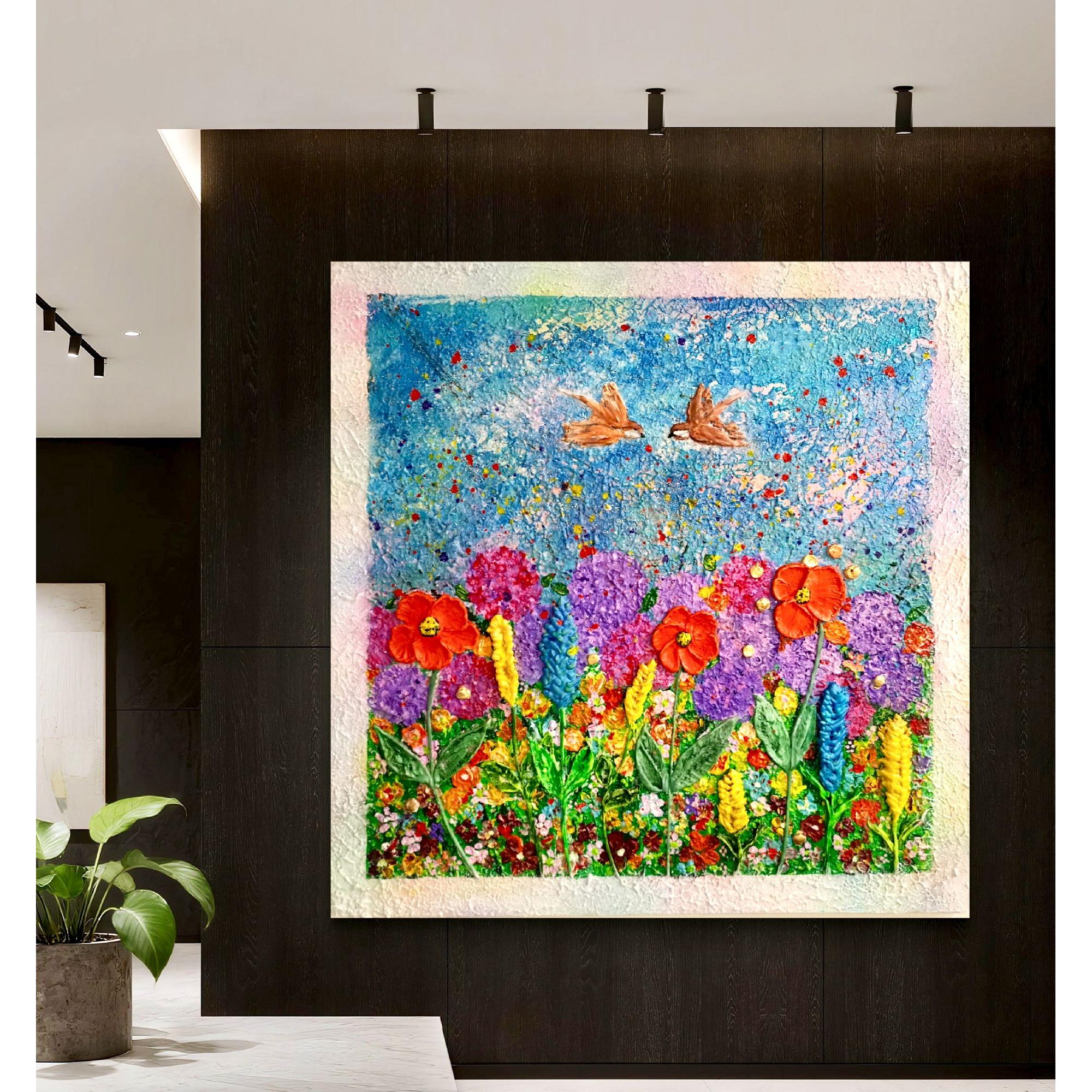Opera vibrante che cattura l'essenza della primavera, con rondini in volo dinamico sopra un prato fiorito.